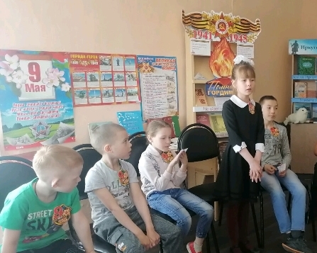 В рамках действия акции оформлена книжно – информационная выставка «Великая Отечественная Война. 1941 – 1945», проведён одноимённый исторический экскурс и информационно-просветительский обзор с демонстрацией тематических фотоматериалов, книг и документов «Малая Родина в большой войне». Выпущена информационная продукция: набор библиографических открыток «Писатели – фронтовики». Чтобы напомнить жителям о предстоящем празднике, раздавались листовки с прикрепленными Георгиевскими ленточками. На листовках размещался материал об истории данного символа. Все с радостью и благодарностью принимали этот подарок. С каждым годом война от нас все дальше и дальше, а ветеранов все меньше и меньше. В нашем поселении их нет. Каждый год в канун Дня Победы библиотекарь вместе с читателями - волонтерами посещают на дому труженика тыла Матвеева А. А., жительницу из категории «дети войны» Попову Н.П. Навестили и ветеранов труда. В их в адрес звучали слова благодарности, поздравительные стихи в фронтовых треугольниках и цветы. Впервые библиотека приняла участие в Международной акции «Читаем детям о Великой Отечественной войне». Так, 5 мая были прочитаны вслух лучшие образцы художественной литературы, посвященной событиям 1941-1945 гг. и великому человеческому подвигу. На встречах с детьми библиотекарь рассказывала о страшных вехах войны и огромной цене, которую заплатила наша страна за Победу, звучали песни военных лет. В сохранении памяти поколений литература о войне остаётся одним из источников, который формирует историческое сознание и чувство патриотизма. Ребята согласились с тем, что участием в данной акции, мы отдаём дань уважения и благодарности нашим соотечественникам, отстоявшим нашу Родину, подарившим нам мирную жизнь. Ведь именно детям отведена миссия, рассказать последующим поколениям о славных вехах нашей истории. Проводимая акция показала, то что мы действительно гордимся своим прошлым, важностью исторической памяти. Она составляет основу патриотизма – чувства, которое закладывается с детства, растет вместе с человеком. Эти мероприятия формируют гражданина Российской Федерации, эстетическое развитие, духовно-нравственные убеждения в выборе жизненных позиций, уважение личности человека, доброты и милосердия.