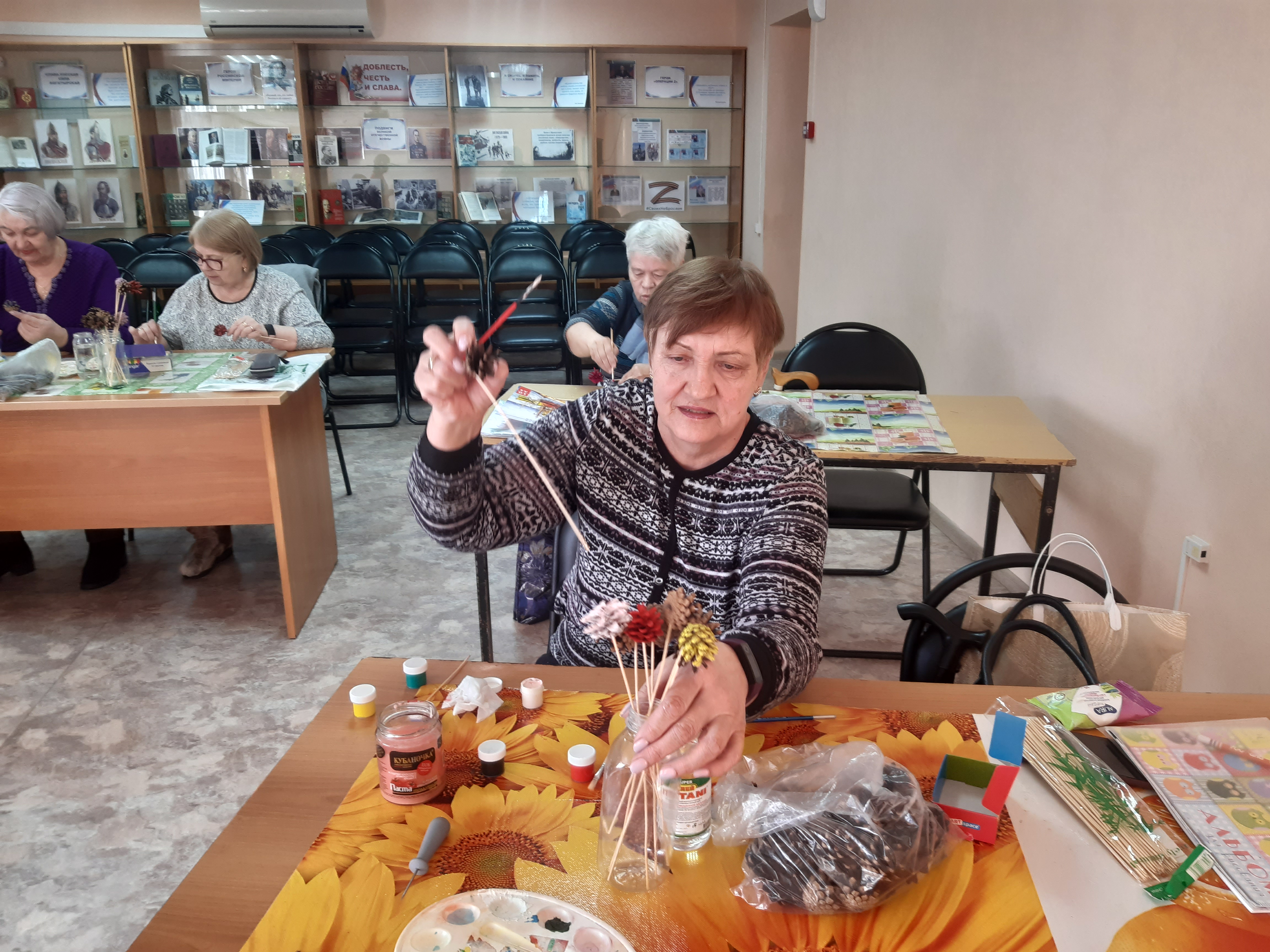 Для участниц студии «Ультрамарин» прошёл мастер-класс по изготовлению оригинального букета из природного материала. В последнее время популярными стали букеты из шишек: стоять такой букет будет долго, и выглядит он очень самобытно. Чтобы сделать такой букет, не нужны ни определенные знания, ни опыт. Все участницы с большим интересом и желанием проявляя свою фантазию принялись за работу. У всех получились оригинальные и красивые букеты из шишек.